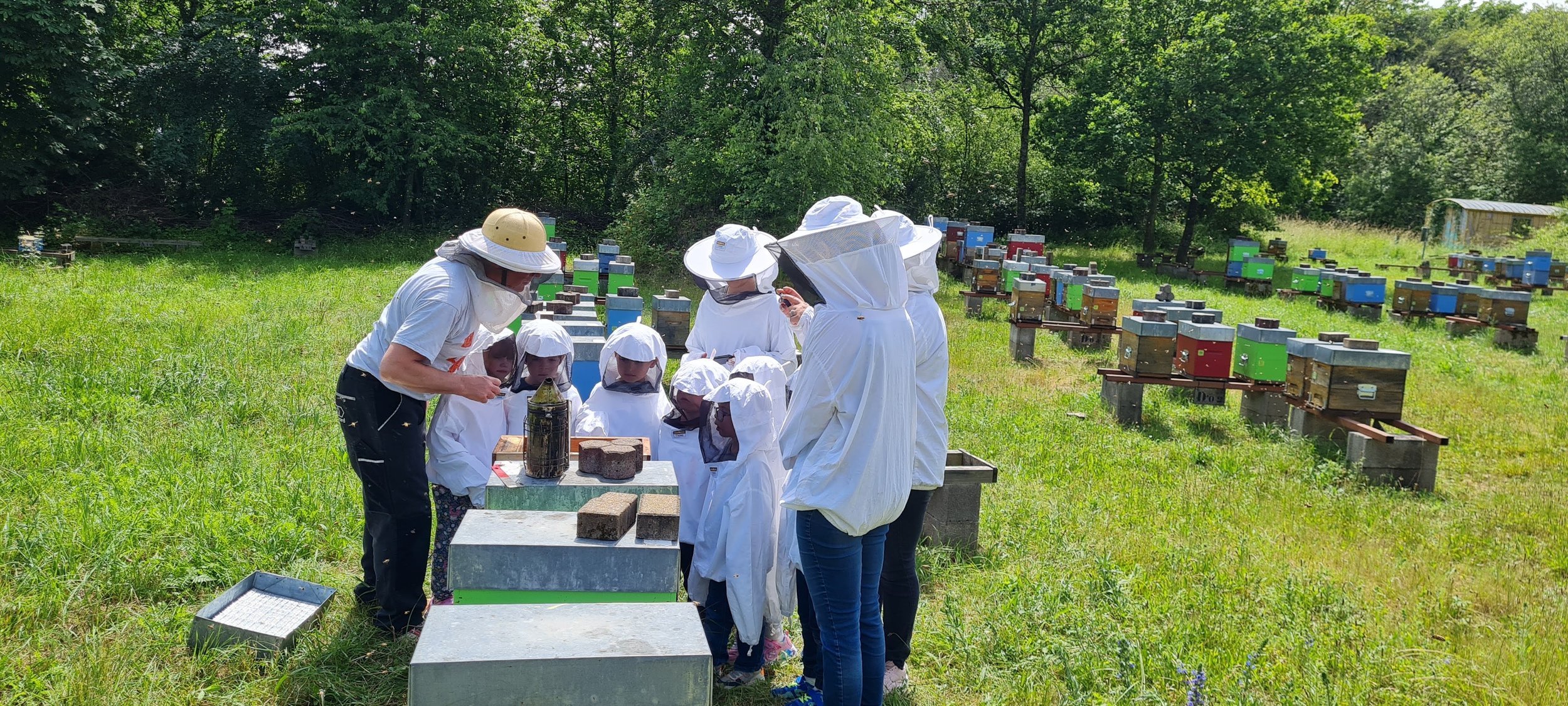 Toutes les précautions sont prises afin que personne ne soit piqué lors de la visite du rucher. Nous avons choisi d'élever des abeilles très douces et chaque enfant ou accompagnateur est protégé.